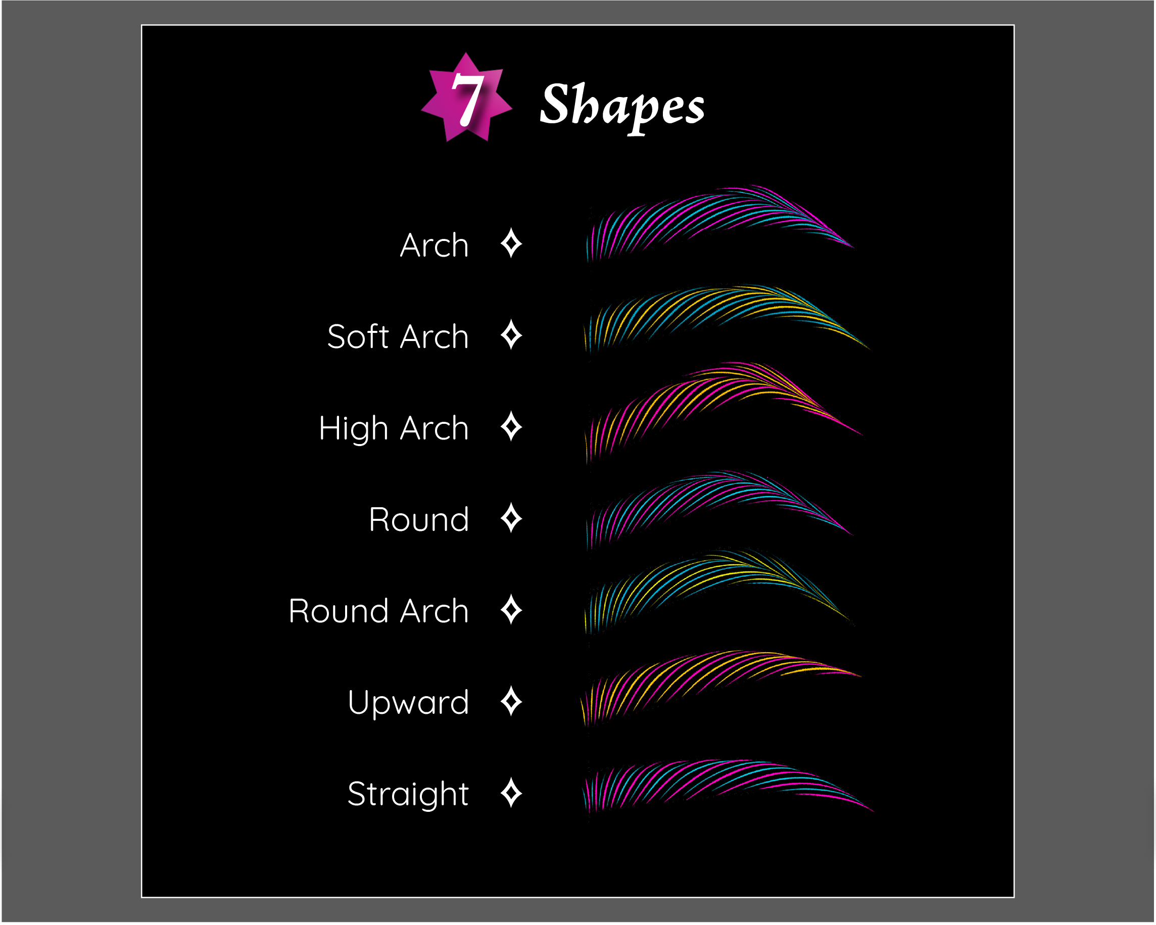 • 7 clean brow shapes: Arched, Soft Arch, High Arch, Round, Round Arch, Upward, Straight